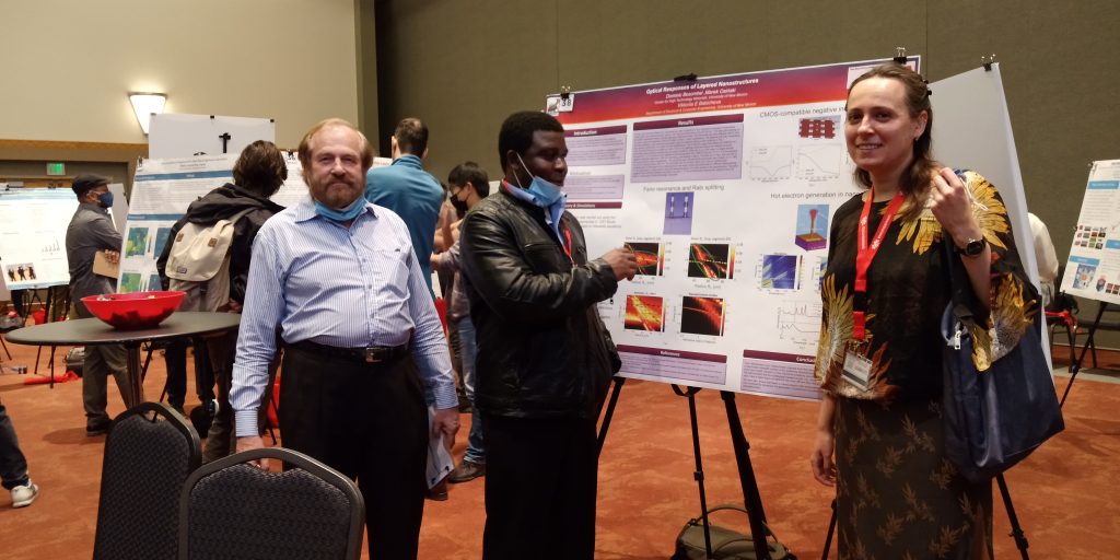 Dominic presents his poster at the 2021 UNM Shared Knowledge Conference, Albuquerque, NM, 11/2021 (and Prof. Marek Osinski has questions to ask ;-))